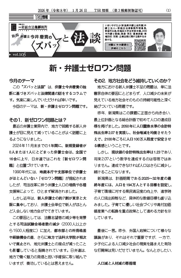 「TSR情報(新潟県版)(2026/01/26発行)」に弁護士 今井慶貴の記事が掲載されました!