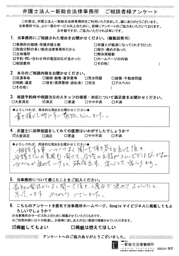 相談する事一つ一つよく聞いて頂き、答えを出して頂き、弁護士さんの意見も聞けて、今後のお話がスムーズではないですがなんとか進めていけると確信でき、安心して帰ります。