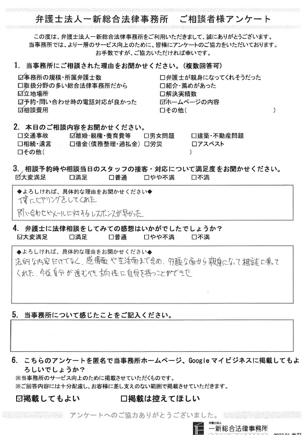 《お客様の声》法的な内容だけでなく、感情面や生活面までを含めたような面から親身になって相談に乗ってくれた