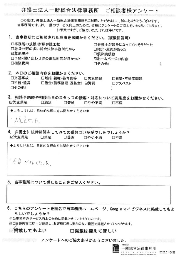 労災で新潟条事務所でご相談されたお客様の声をご紹介いたします